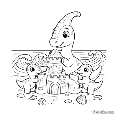 В разделе 181 раскраска с динозаврами, и сюжеты здесь далеко не однообразные: детёныш трицератопса дремлет на камне, стегозавр щиплет папоротник, анкилозавр строит песчаный замок, птерозавр ловит рыбу в приливном бассейне, а семья паразауролофов греется на берегу. Есть и нестандартные истории — хаски Лутик в компании динозаврика или осьминожка-археолог рядом с доисторическим гигантом.