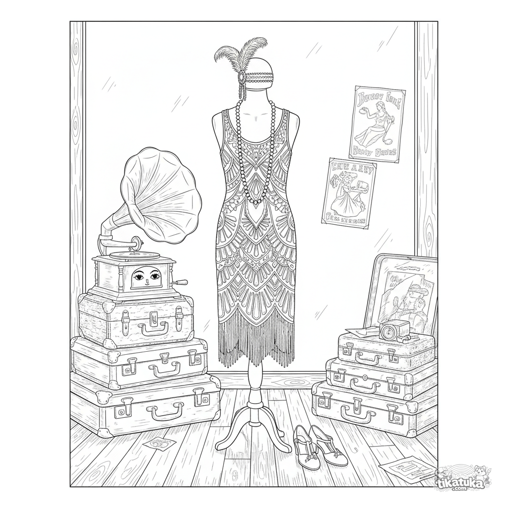Сложная раскраска для 10-12 лет: винтажное платье флэппер 1920-х годов на манекене в витрине антикварного магазина. Детализированная сцена с бусами, перьями, граммофоном и тенями.