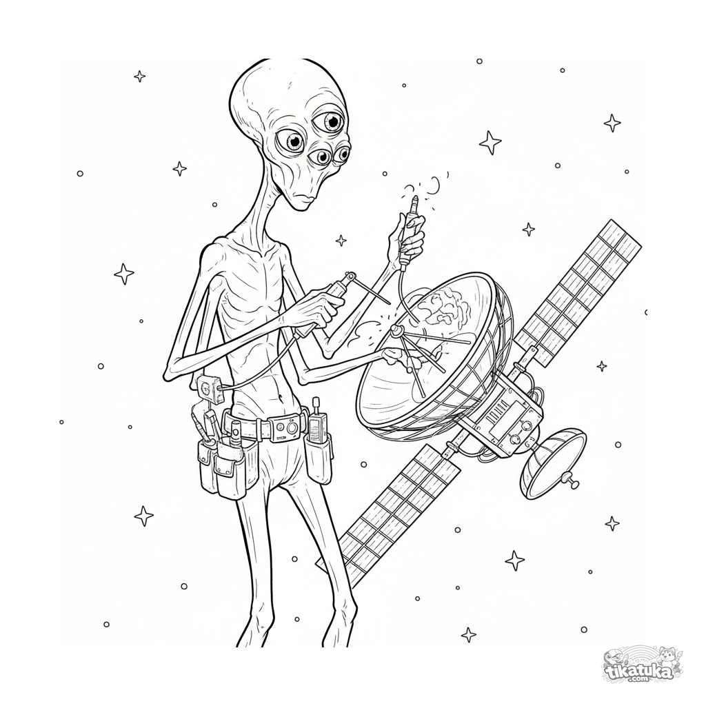 Раскраска для детей 10-12 лет: детализированная сцена, где инопланетный механик ремонтирует спутниковую антенну в открытом космосе среди звезд. Сложная техническая раскраска.