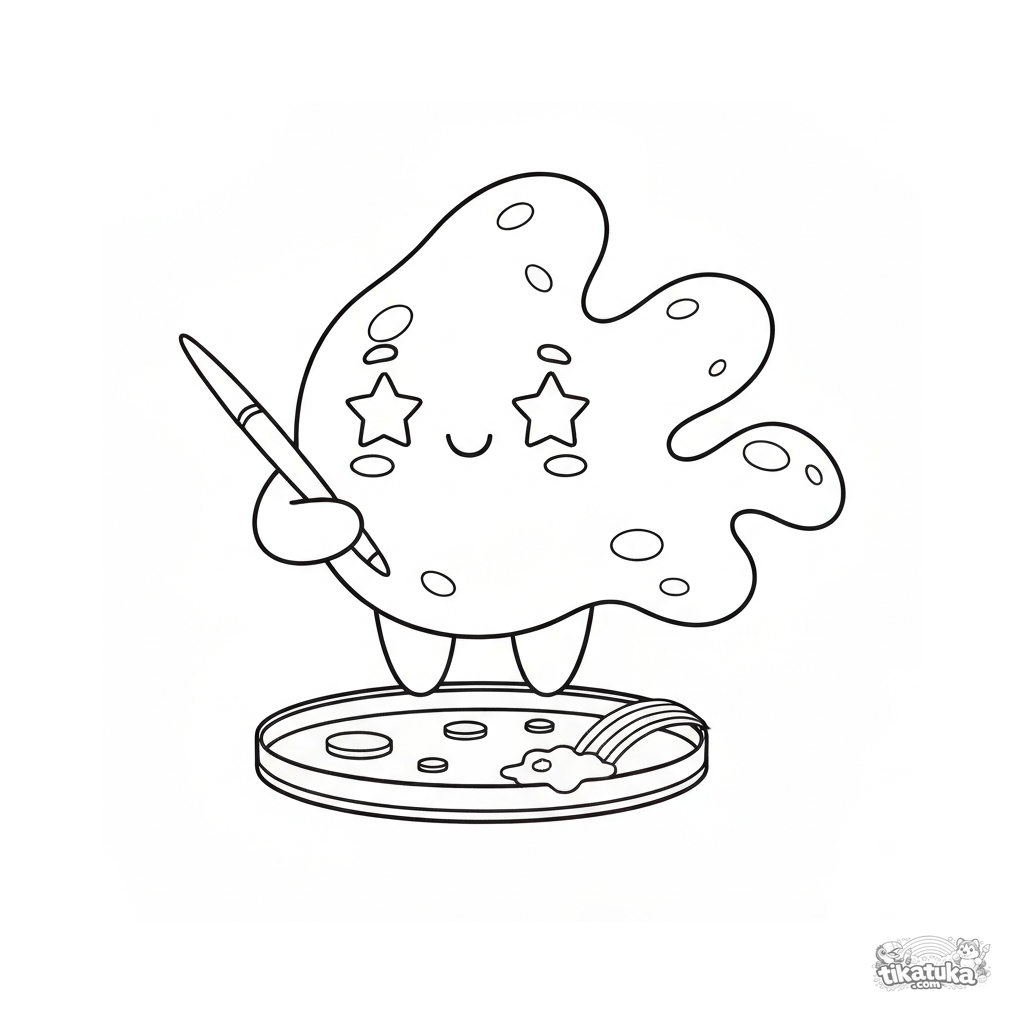 Раскраска для детей 6-9 лет. Забавная амёба с кисточкой рисует радугу на чашке Петри. Звёздные глазки и волнистые ложноножки. Скачать бесплатно.