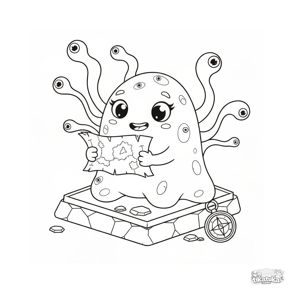 Раскраска для детей 6-9 лет. Забавная амёба с псевдоподиями, глазами, картой сокровищ и компасом на предметном стекле микроскопа. Скачать бесплатно.