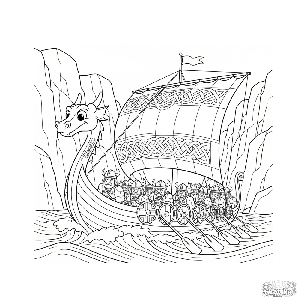 Сложная раскраска для детей 10-12 лет: древний драккар викингов плывёт по бурному фьорду. Динамичная сцена в стиле комикса с множеством деталей.