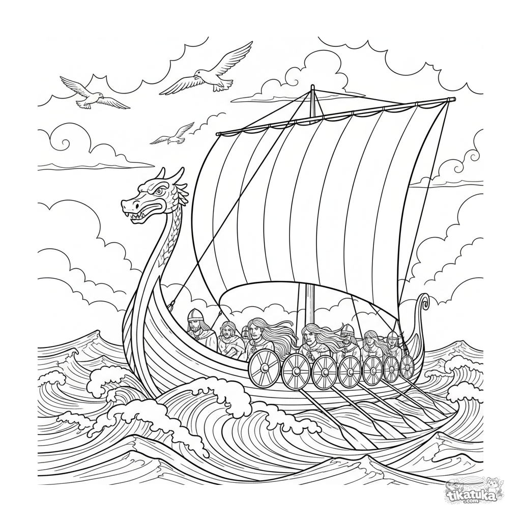 Раскраска для детей 7-9 лет: древний драккар викингов с драконьей головой плывёт по бурному морю. Динамичная сцена с воинами и щитами.