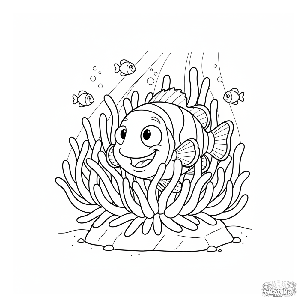 Раскраска для детей 7-9 лет: весёлая рыба-клоун резвится среди щупалец актинии на солнечном мелководье. Динамичная сцена с другими рыбками на заднем плане.