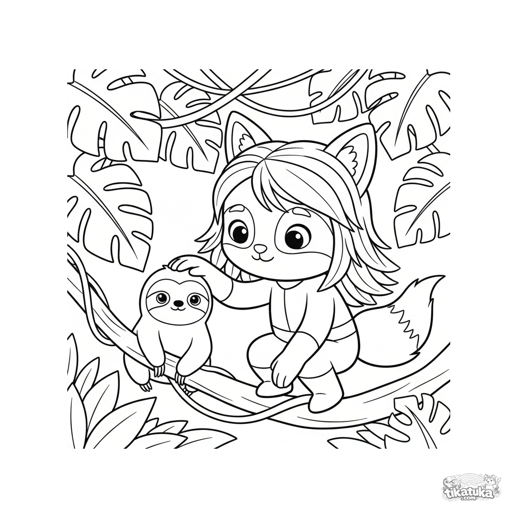 Простая раскраска для малышей 2-3 года: герой с ушками и хвостом лисы знакомится с маленьким ленивцем на лиане в густых джунглях.