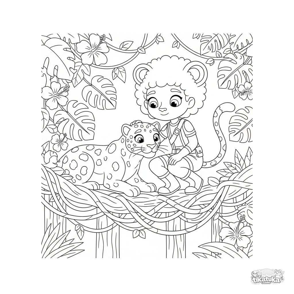 Раскраска для детей 4-6 лет: супергерой с чертами ягуара и его пушистый напарник-ягуар на лианах в густом тропическом лесу.