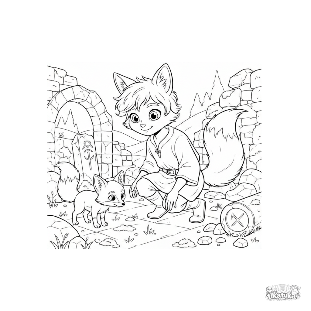 Раскраска для детей 7-9 лет: супергерой с лисьими ушами и хвостом исследует древние руины с лисичкой-напарником. Сцена в стиле научного рисунка.