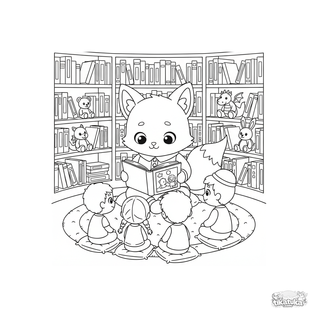 Раскраска с добрым супергероем, имеющим лисьи ушки и хвост, читающим книгу детям в библиотеке. Для детей 4-6 лет, уютная и спокойная сцена.