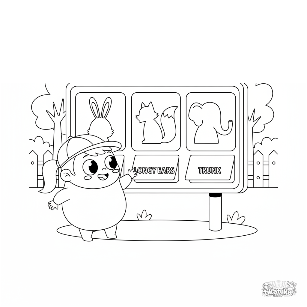 Раскраска для детей 4-6 лет: ребенок играет в игру 'Угадай животное по силуэту' на интерактивном стенде в зоопарке. Познавательная и увлекательная сцена для развития наблюдательности.
