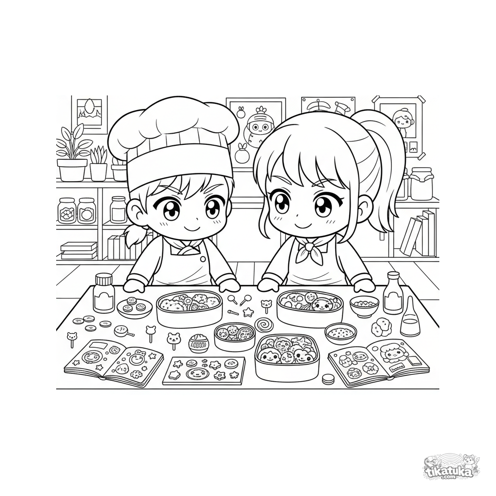 Раскраска в аниме-стиле: участники кулинарного клуба создают художественные бенто-боксы в школьном классе. Динамичная и детализированная сцена для детей 10-12 лет.