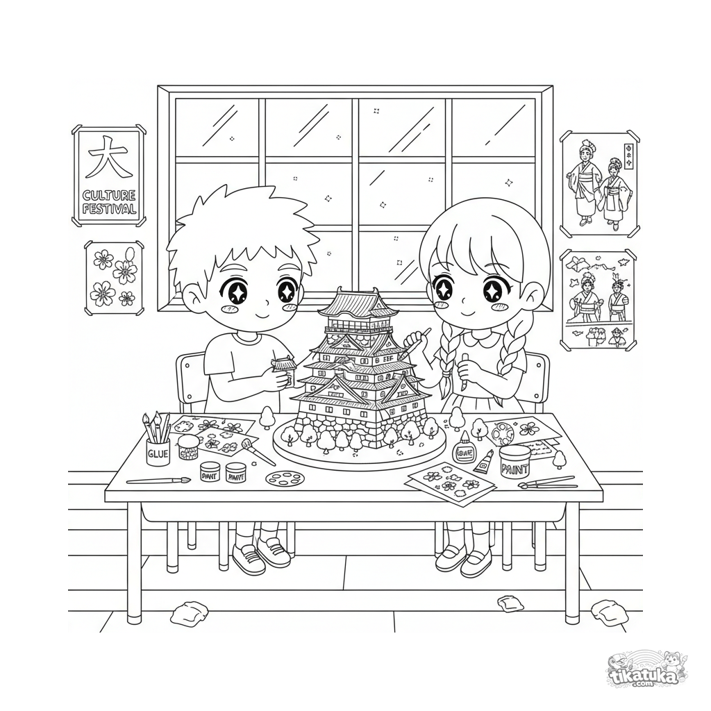 Раскраска в стиле аниме: двое школьников создают диораму для культурного фестиваля. Детализированная сцена в классе с множеством предметов для творчества, для детей 10-12 лет.