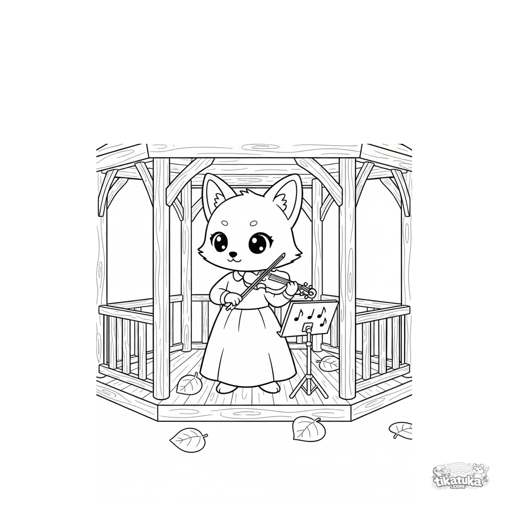 Раскраска в стиле аниме для детей: лисичка играет на скрипке в парковой беседке. Умиротворённая осенняя сцена с нотами и листьями.