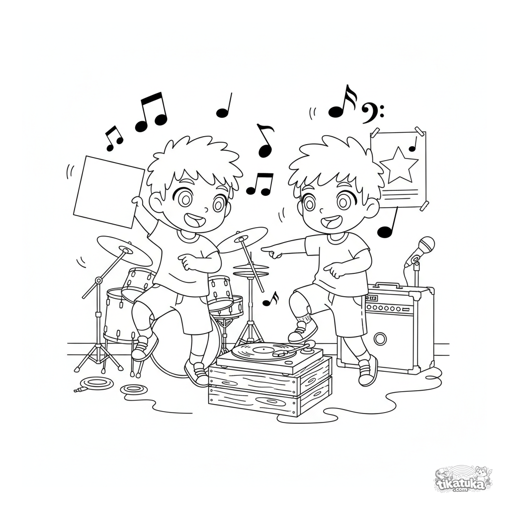 Раскраска для детей 6-9 лет в аниме-стиле: весёлые дети танцуют в гараже под виниловый проигрыватель. Динамичная сцена с нотами и пластинкой.
