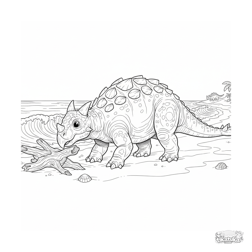 Раскраска для детей 10-12 лет: детализированный анкилозавр исследует берег древнего океана, собирая коряги. Реалистичный стиль, развивающий моторику.