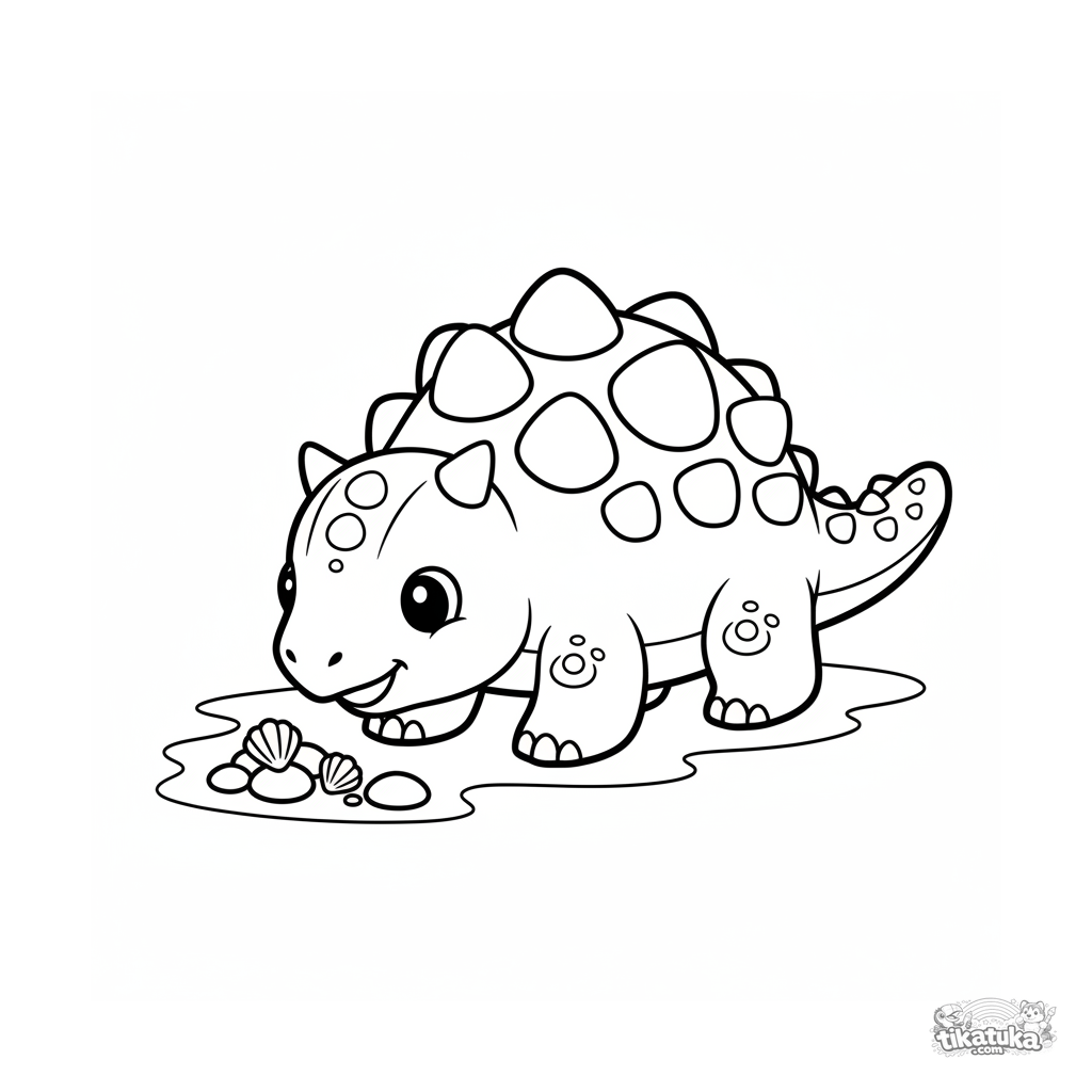 Очень простая раскраска для малышей 2-3 лет: большой анкилозавр гуляет по пляжу древнего океана и собирает ракушки. Крупные формы, широкие белые поля, минимум деталей.
