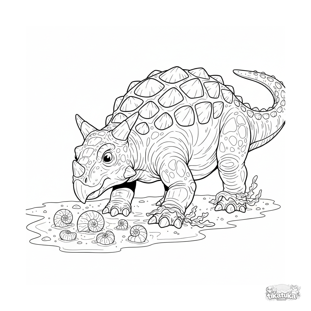 Раскраска для детей 10-12 лет: детализированный анкилозавр, роющий песок в поисках ракушек на берегу древнего океана. Реалистичное полевое изображение.