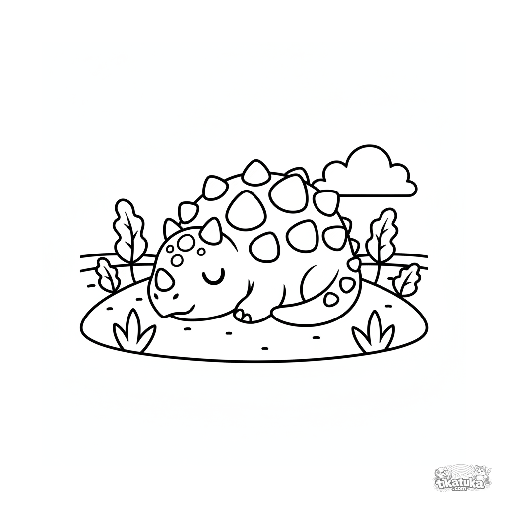 Очень простая раскраска для малышей 2-3 лет: анкилозавр спит на песчаной дюне у древнего океана. Крупные формы, толстые контуры, мало деталей.