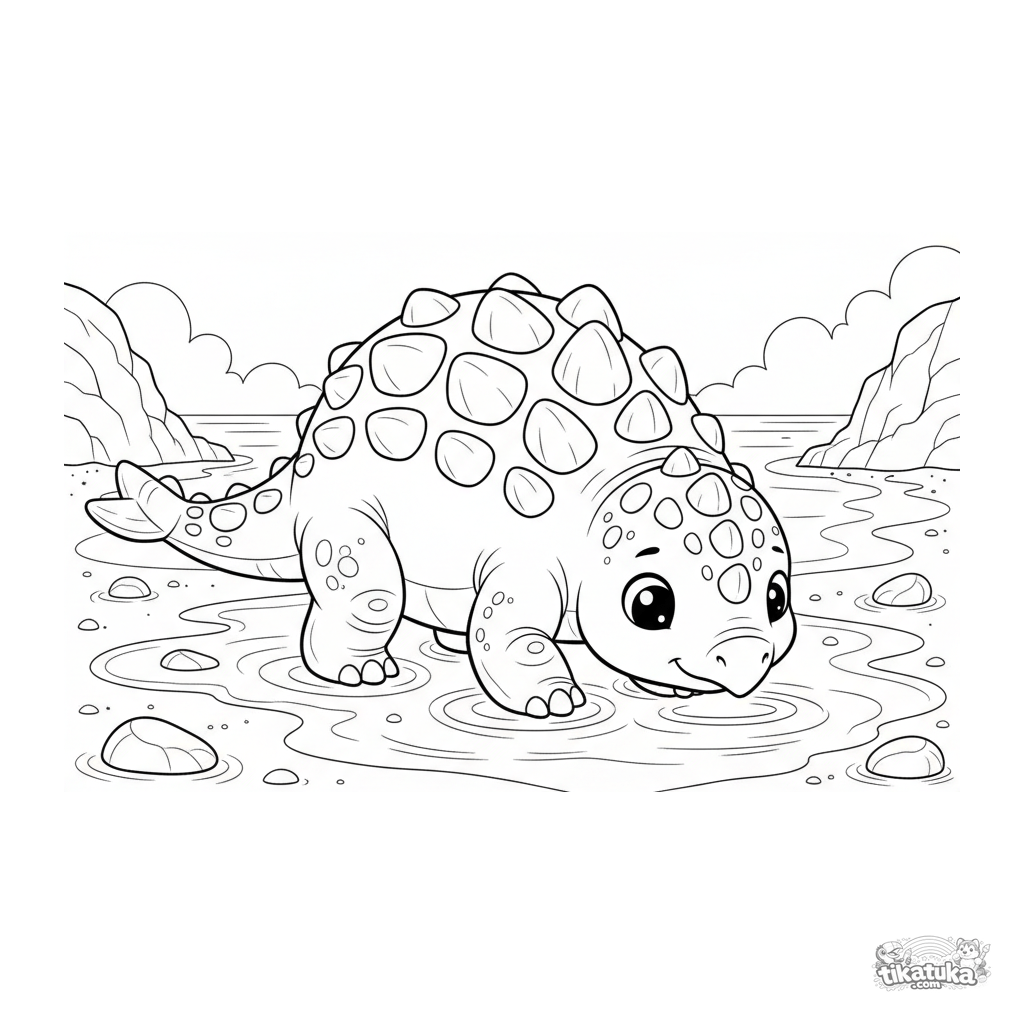 Раскраска анкилозавр на песчаном пляже древнего океана. Для детей 4-6 лет. Динозавр изучает мокрый песок у кромки воды.