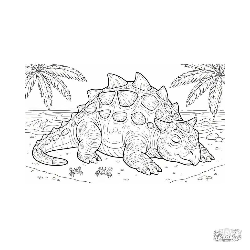 Детальная раскраска для детей 10-12 лет: анкилозавр мирно дремлет на солнечном песке древнего побережья. Реалистичное изображение бронированного динозавра для увлеченных раскрашиванием.