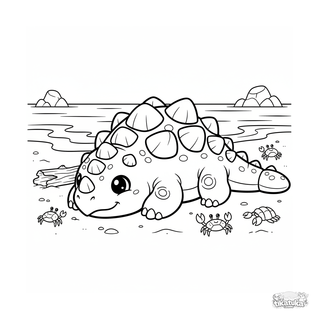 Раскраска для детей 7-9 лет: бронированный анкилозавр мирно греется на боку на песчаном пляже древнего океана. Умиротворённая сцена с деталями панциря и корягой.