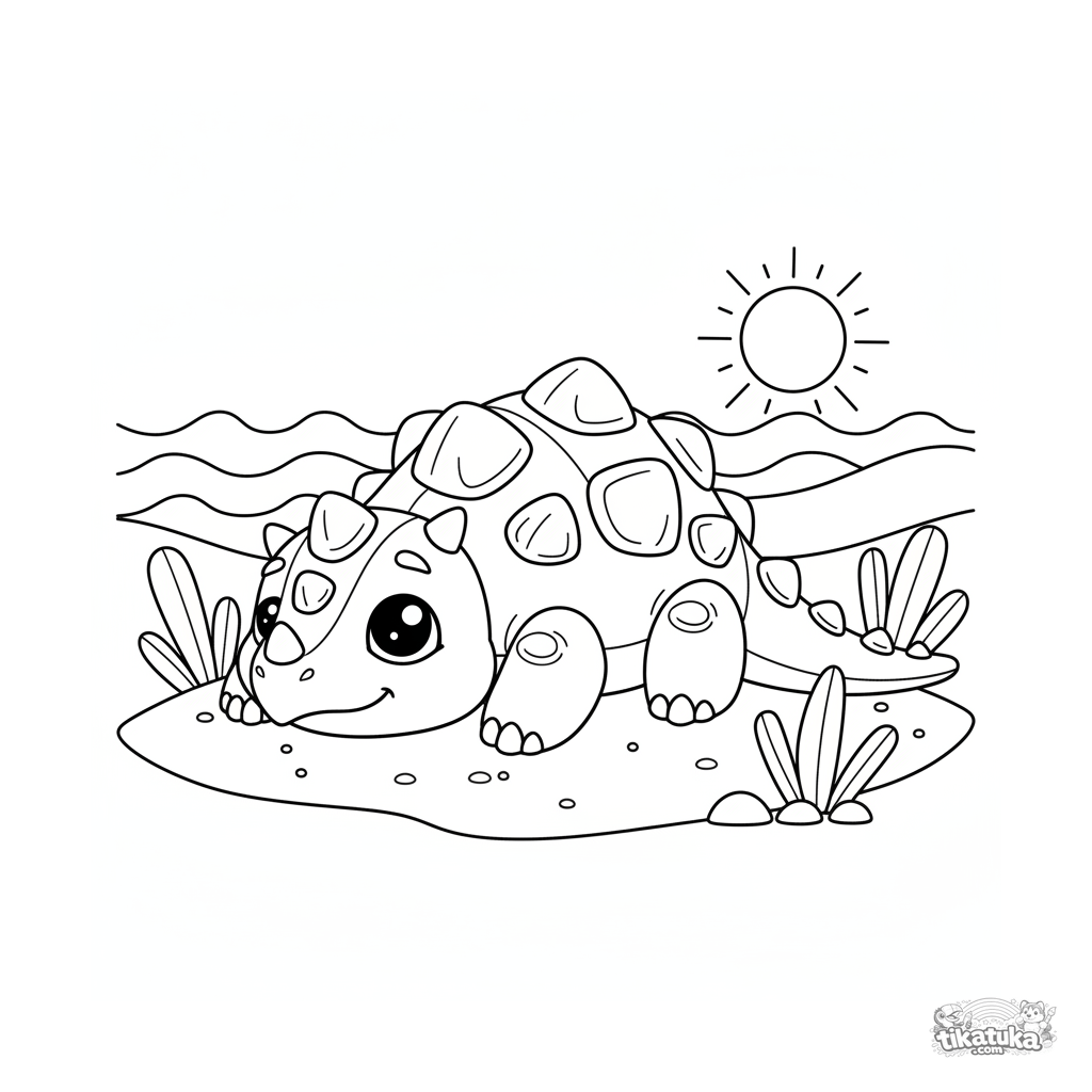 Раскраска для детей 4-6 лет: анкилозавр греется на солнце на песчаных дюнах древнего побережья. Умиротворяющая и милая картинка.