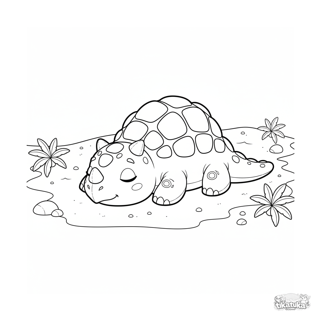 Раскраска уютного анкилозавра, греющегося на теплом песке древнего пляжа. Для детей 4-6 лет. Округлые формы, приятная сцена.