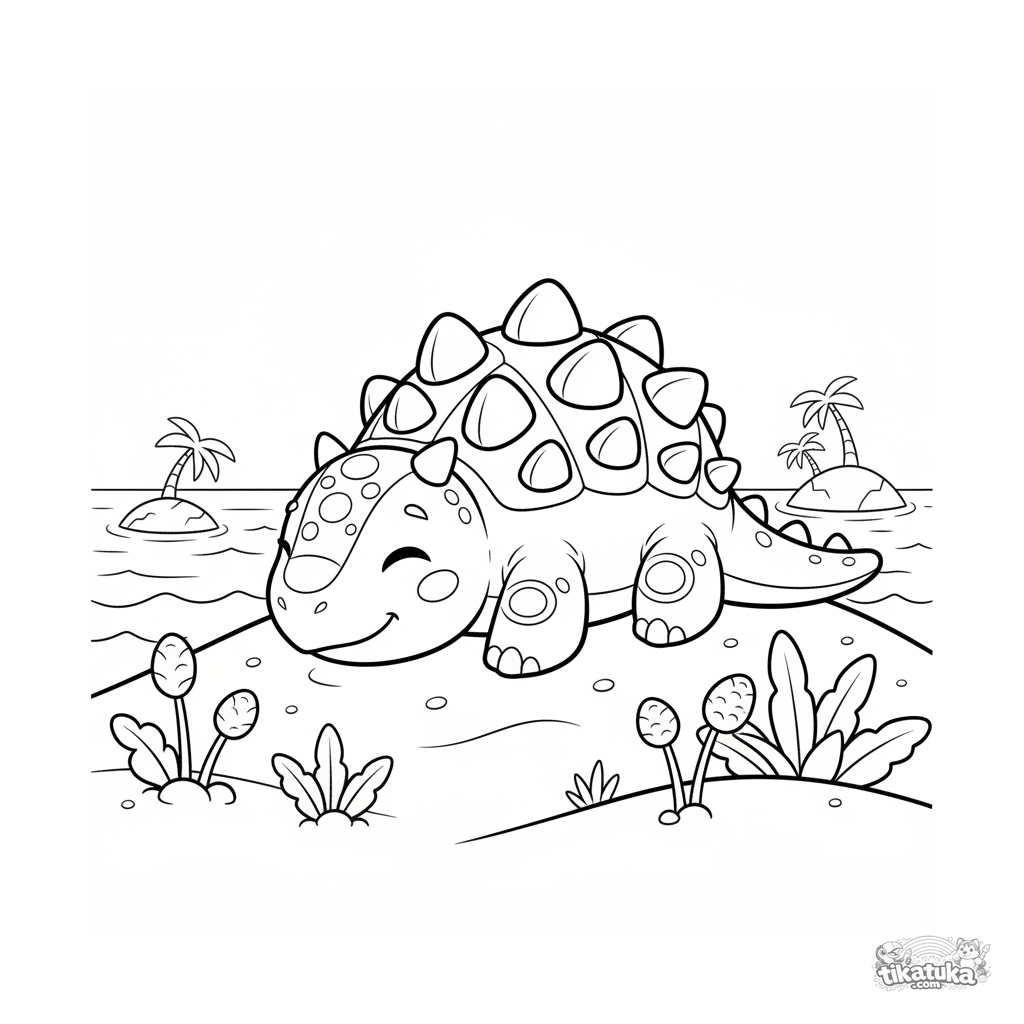 Раскраска для детей 7-9 лет: упитанный анкилозавр греется на солнце на песчаной дюне у древнего океана. Чёткие контуры, умиротворённая сцена.