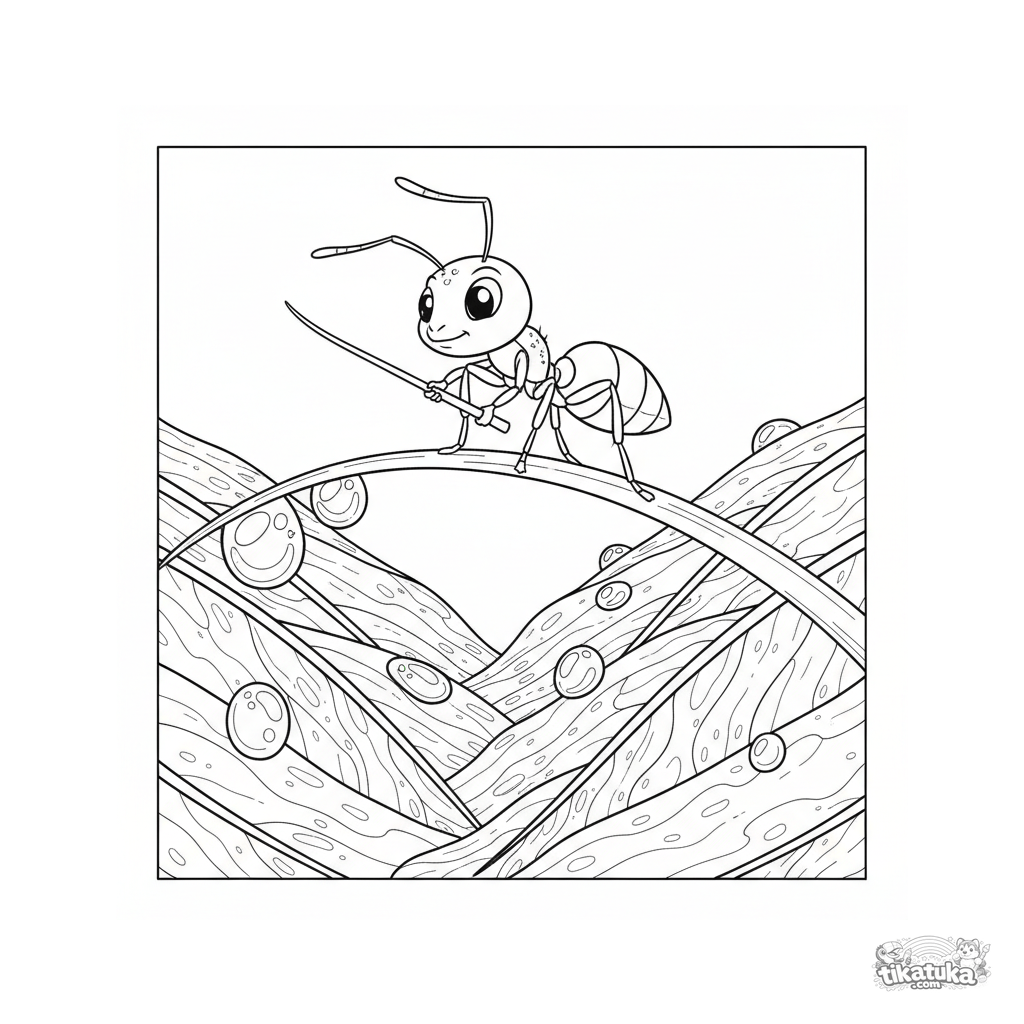Раскраска для детей 10-12 лет: муравей-канатоходец идет по травинке между каплями росы на большом листе. Детализированная сцена с элементами цирка.