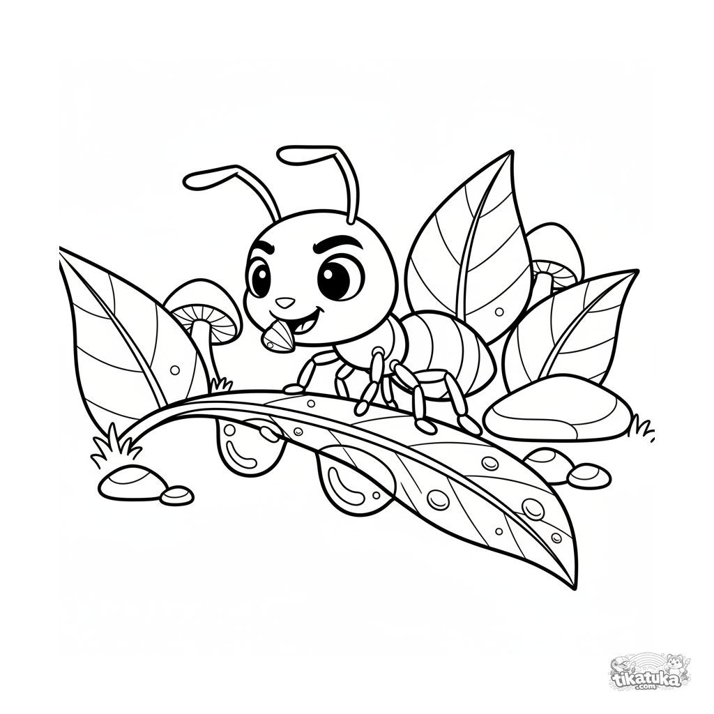 Динамичная раскраска для школьников: муравей смело пересекает хрупкий мост из двух капель росы на листе. Стиль комикса-приключения и выразительная поза для детей 7-9 лет.