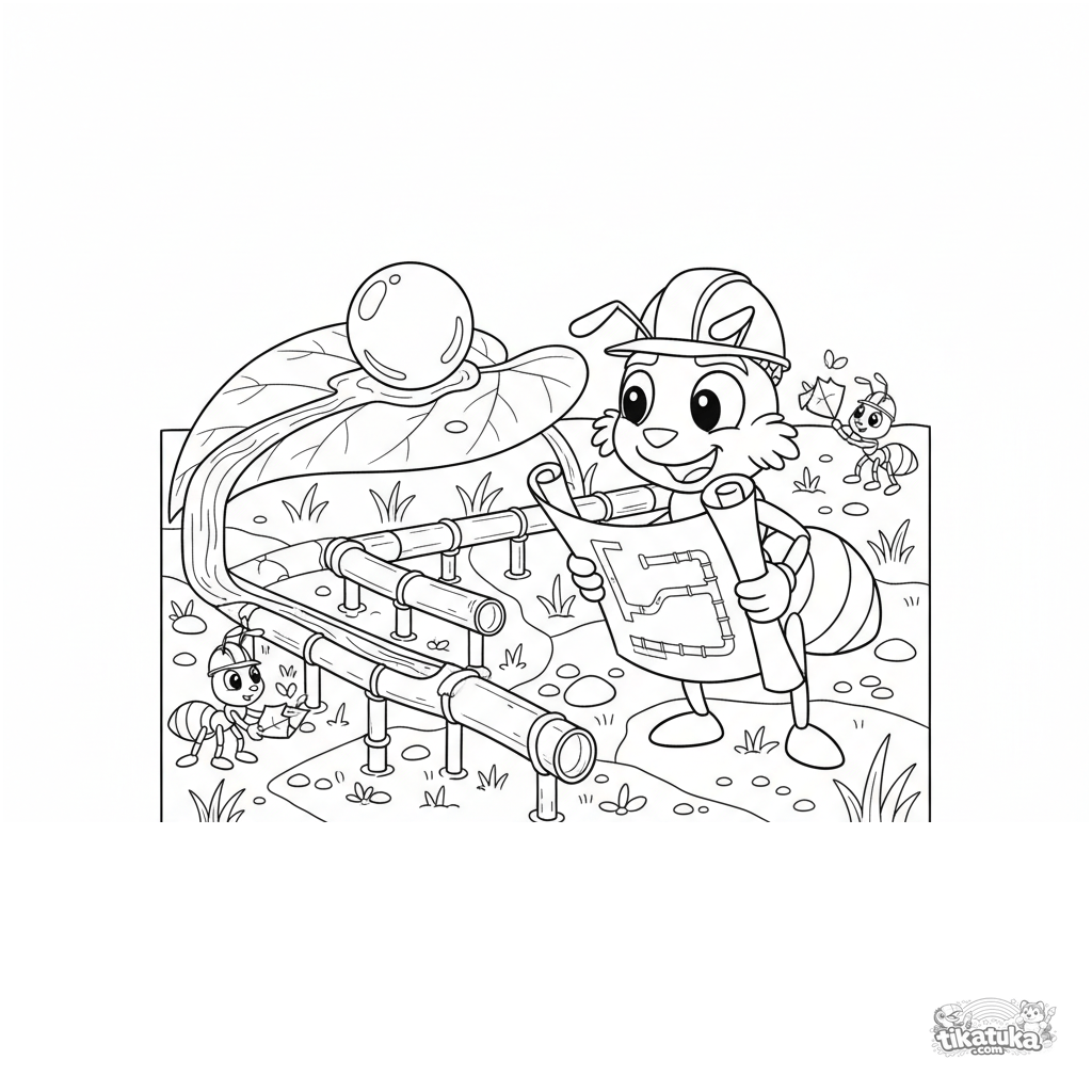 Сложная раскраска для детей 10-12 лет: муравей-инженер руководит постройкой акведука из травинок для капли росы на листе. Технический стиль.