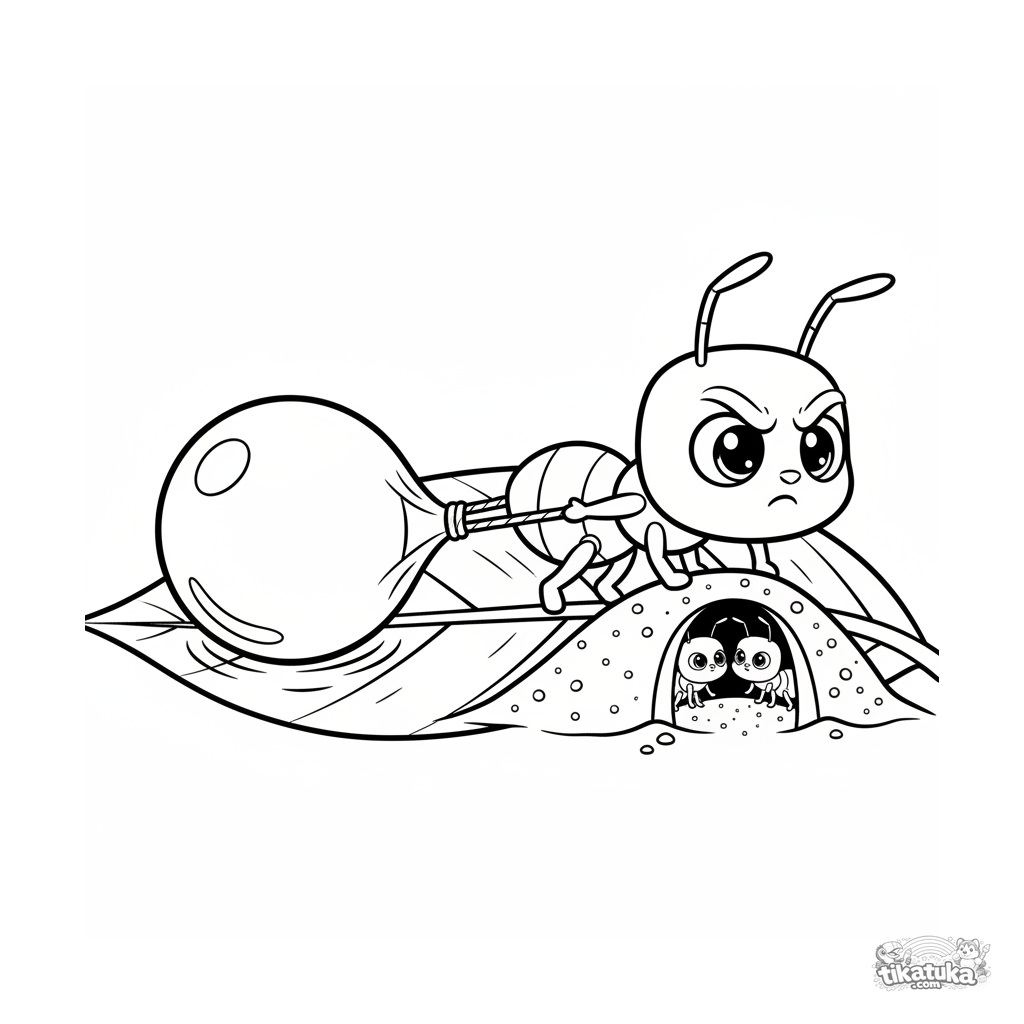 Раскраска для детей 7-9 лет: муравей в динамичной позе тянет большую каплю росы к своему муравейнику у основания листа. Сцена в стиле комикса.