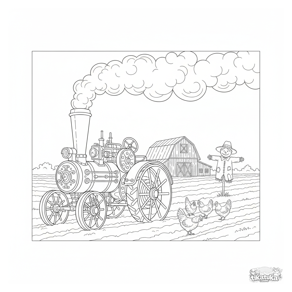 Детализированная раскраска старинного парового трактора, вспахивающего поле. Для мальчиков 8-12 лет. Реалистичный стиль с множеством элементов.