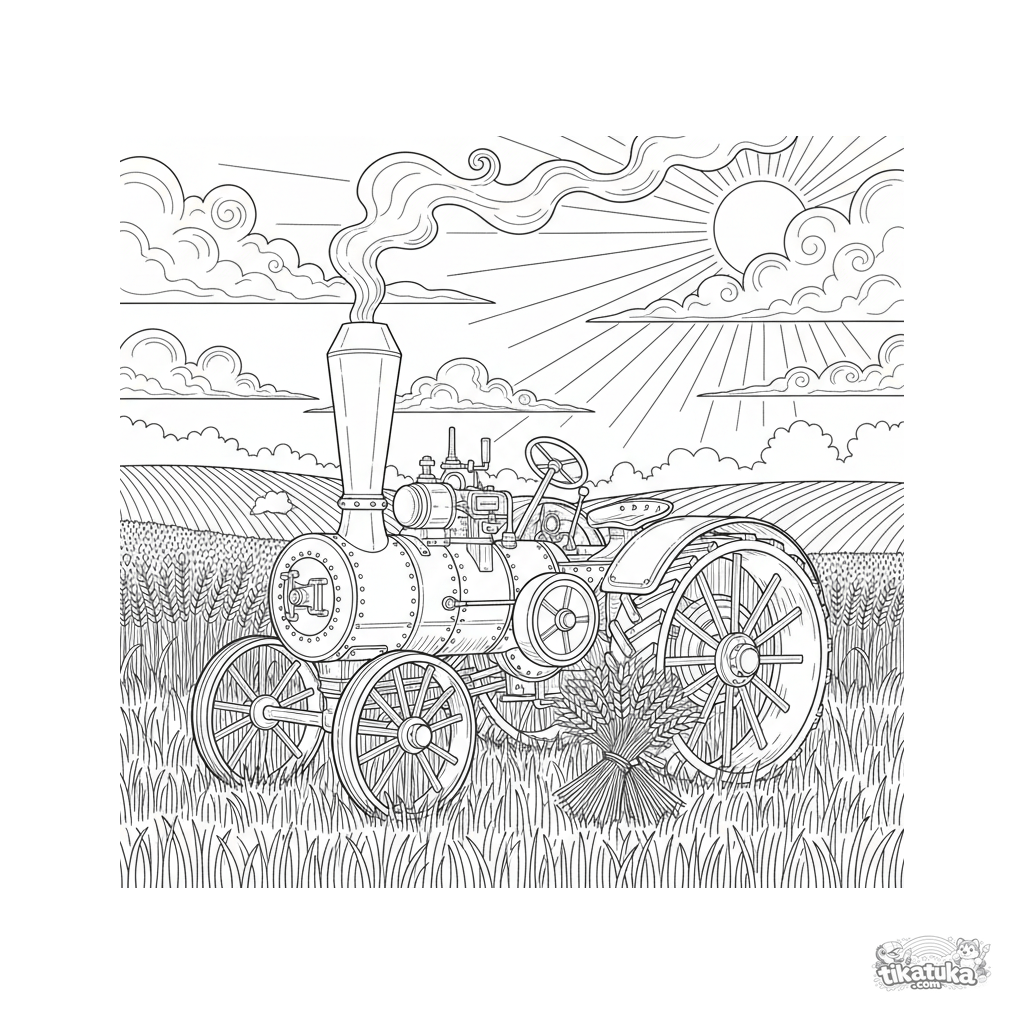 Сложная раскраска с детализированным старинным паровым трактором в пшеничном поле. Для детей 8-12 лет. Много механических и природных деталей.