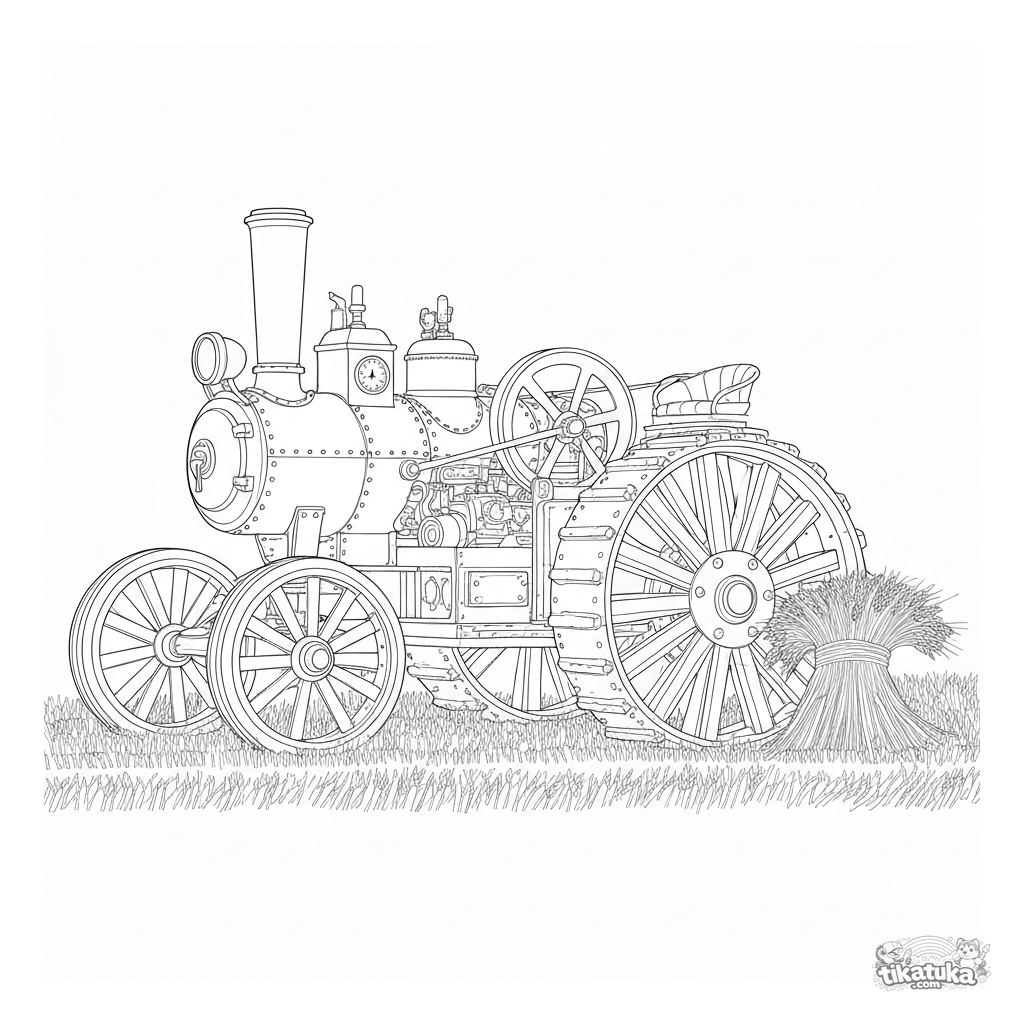 Сложная раскраска в реалистичном стиле с детализированным старинным паровым трактором в поле. Для детей 8-12 лет. Много механических деталей.