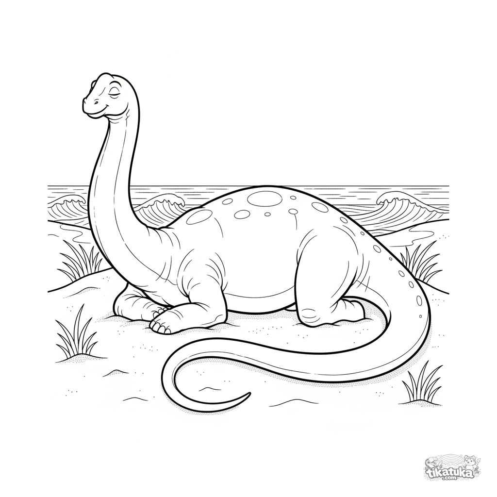 Раскраска для детей 7-9 лет: огромный апатозавр мирно отдыхает на тёплой песчаной дюне с видом на древний океан. Реалистичные пропорции, спокойная сцена.