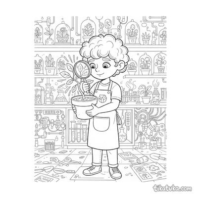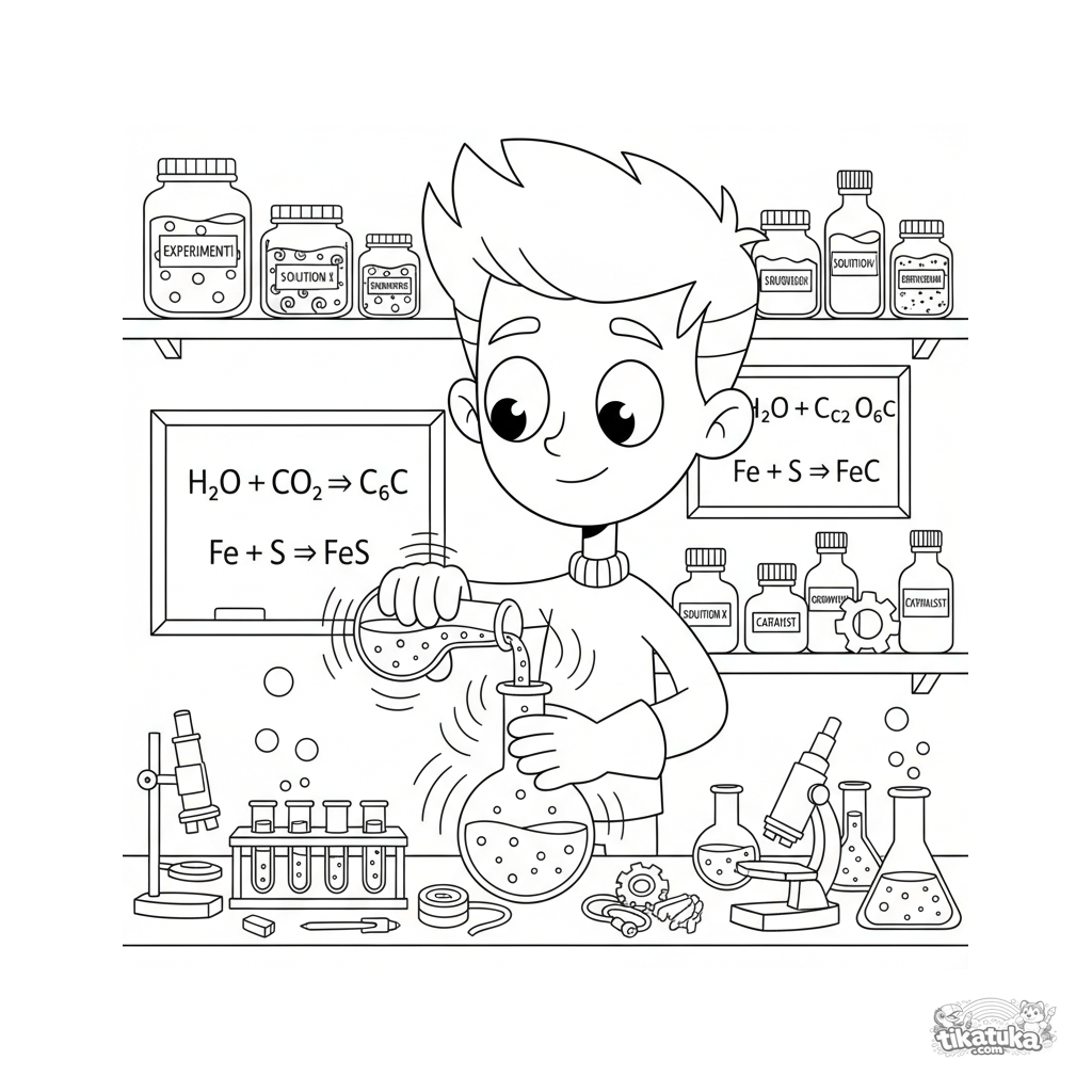 Сложная раскраска для детей 10-12 лет: ученик-изобретатель в секретной лаборатории проводит химический опыт со светящейся формулой среди колб и реактивов.