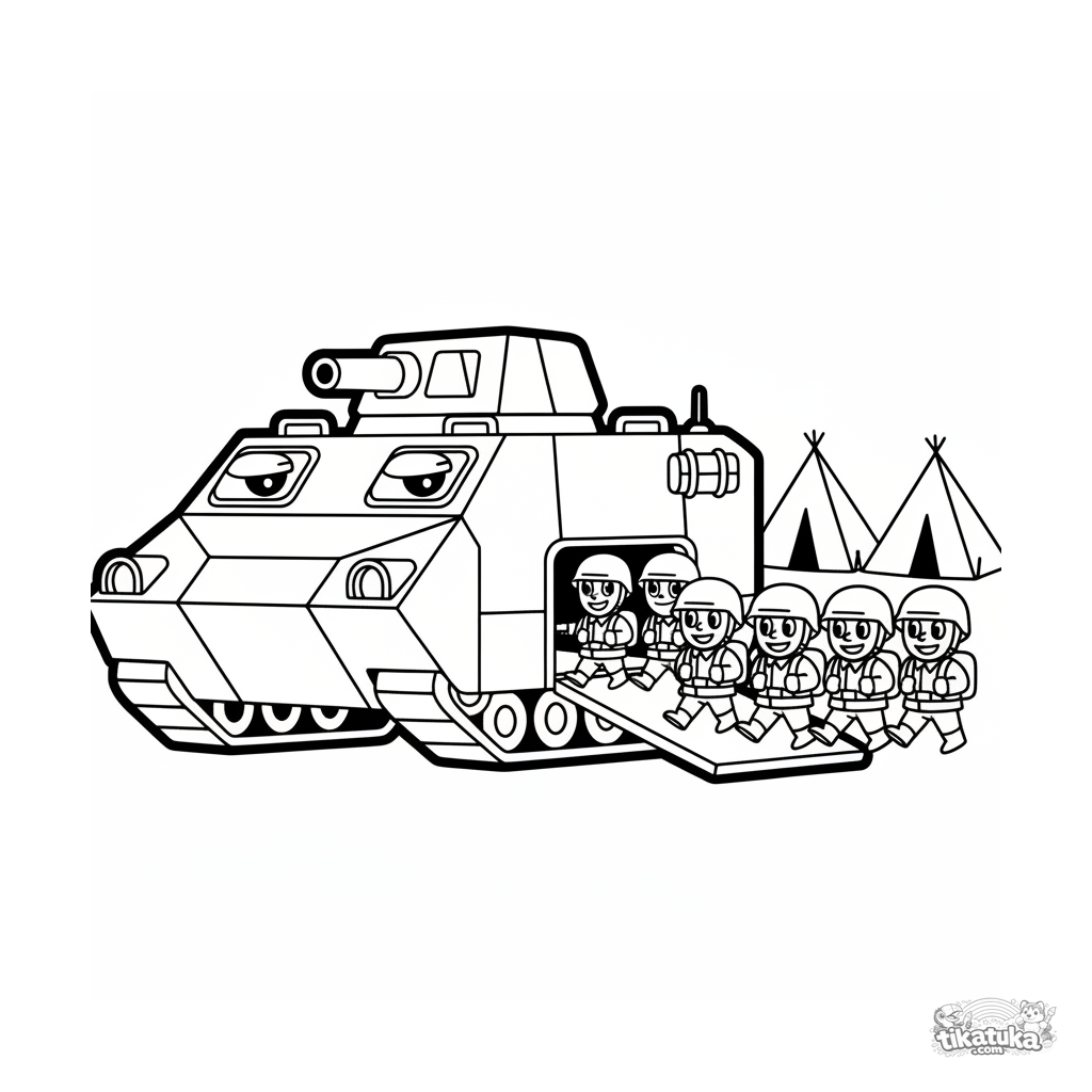 Раскраска для малышей 2-3 лет: большой бронетранспортёр с опущенной рампой высаживает солдат у полевого лагеря. Простые формы, гусеницы, широкие поля.