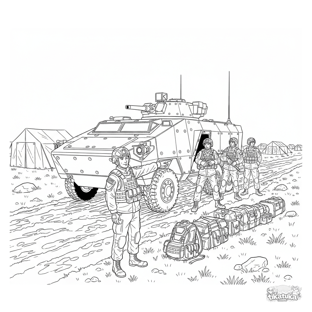 Детальная раскраска бронетранспортёр, прибывший в полевой штаб. Для детей 10-12 лет. Солдаты высаживаются, открыт трап, изображены палатки и снаряжение.