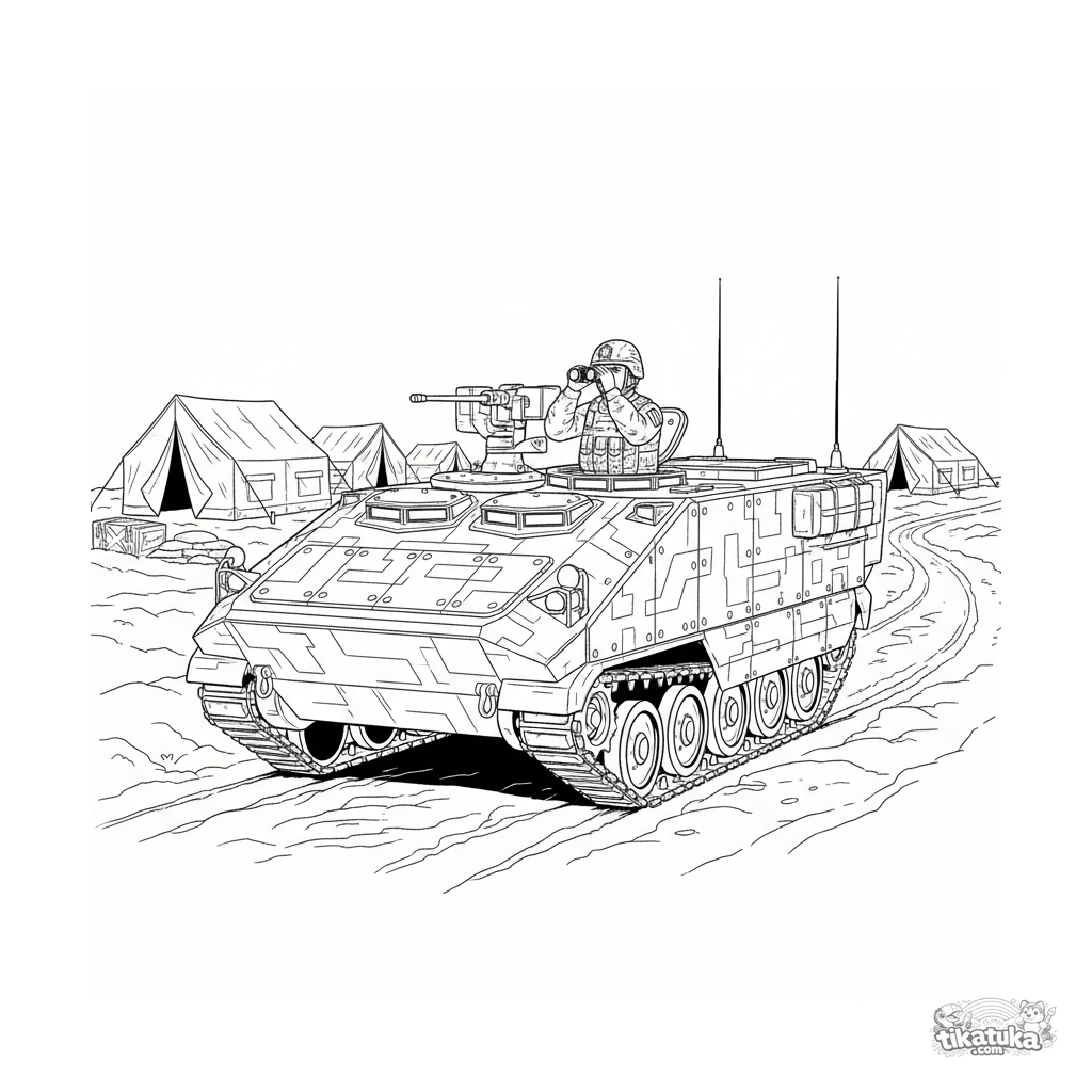 Сложная раскраска для детей 10-12 лет: детализированный бронетранспортёр на патрулировании возле полевого штаба. Реалистичный камуфляж, технические детали, атмосфера боевого дежурства.
