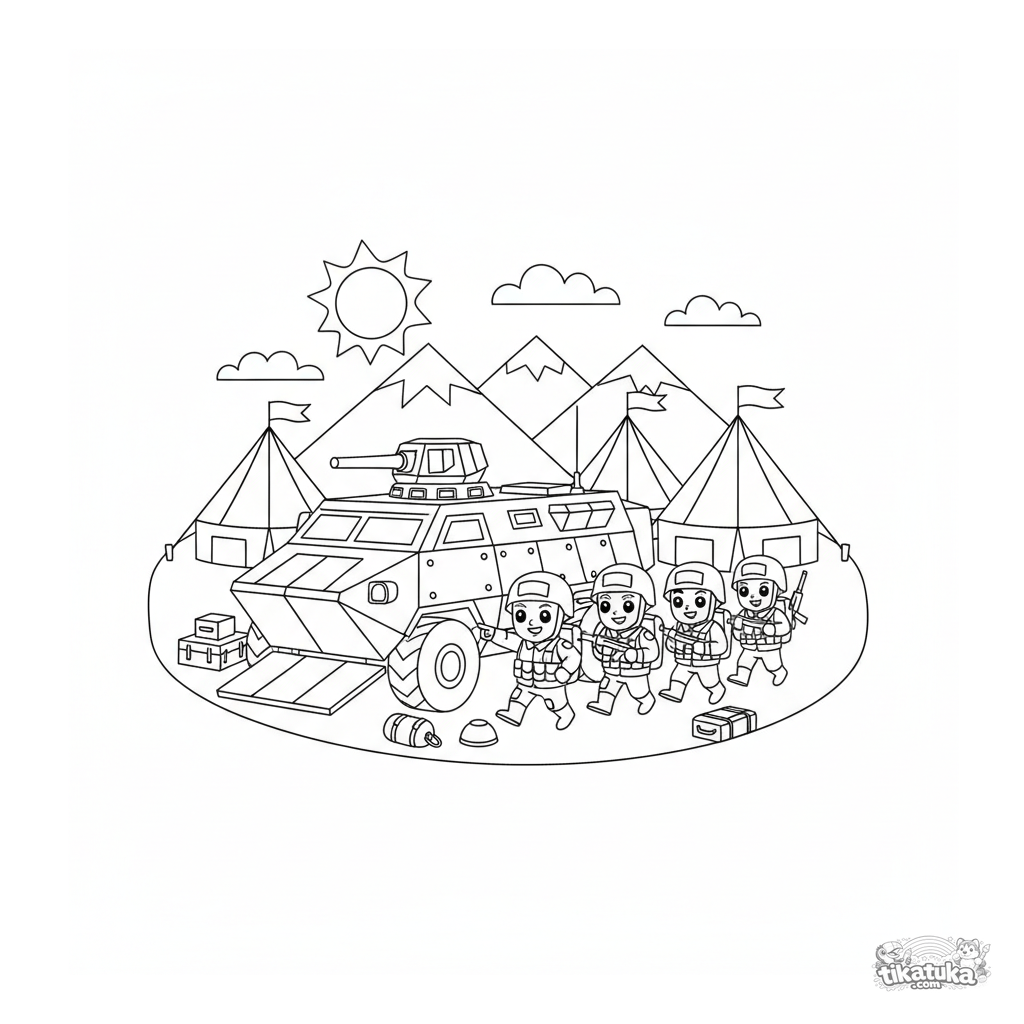 Раскраска для детей 7-9 лет: современный бронетранспортёр с опущенной аппарелью высаживает десант у палаток полевого штаба. Солдаты в полной экипировке указывают на командный центр.