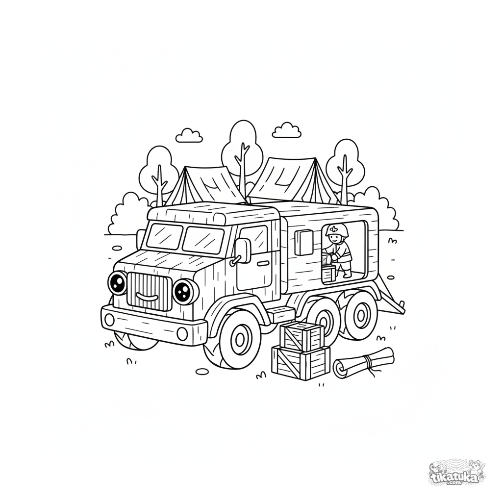 Раскраска для детей 4-6 лет: бронетранспортёр доставляет ящики с припасами к полевому штабу с палатками. Простые формы, дружелюбный дизайн.