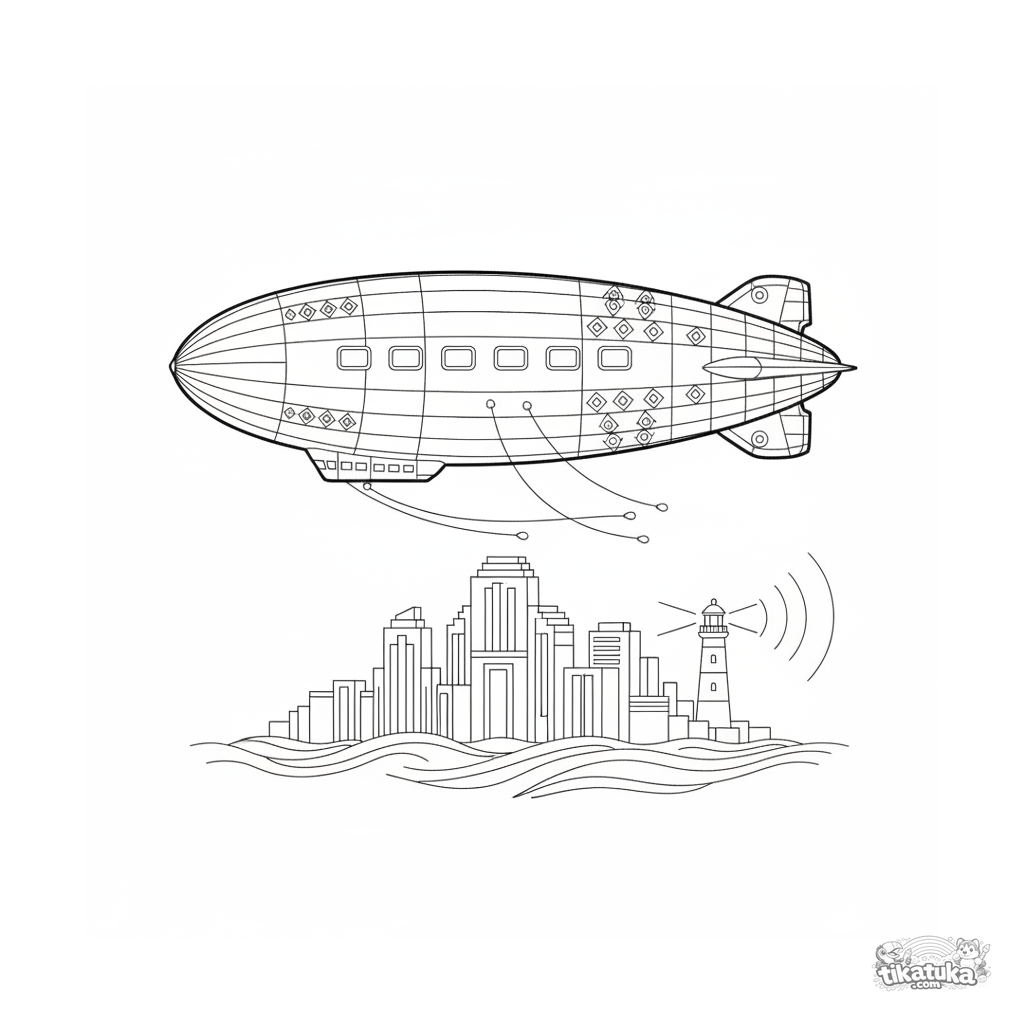 Детализированная раскраска дирижабля в стиле ар-деко, летящего над прибрежным городом в сумерках. Для детей 10-12 лет. Элегантные линии, окна, городской пейзаж.