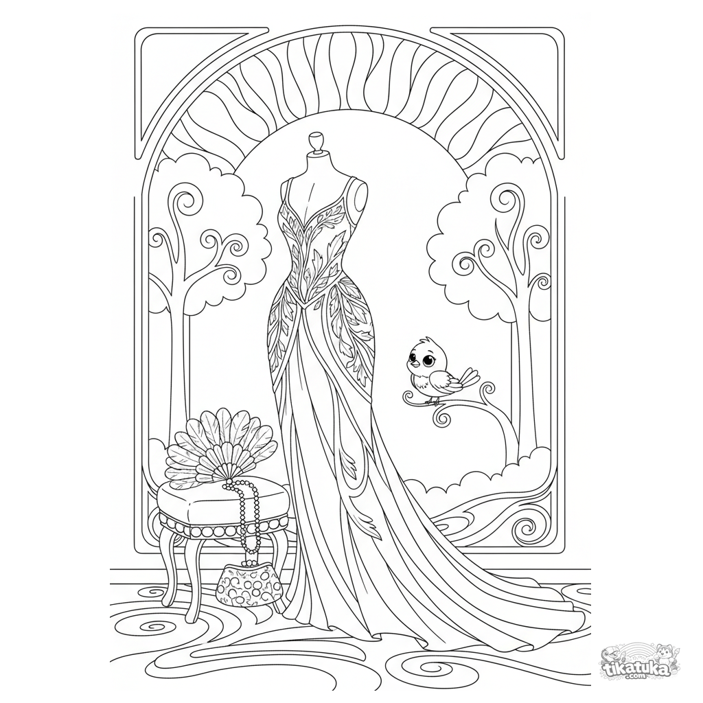 Раскраска для детей 10-12 лет: изящное бальное платье в стиле ар-нуво на манекене в витрине бутика. Сложные линии, цветочные мотивы и аксессуары.