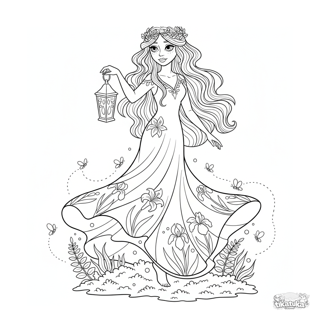 Раскраска для детей 10-12 лет: лесная фея в детализированном платье в стиле ар-нуво кружится в лунной поляне. Сложная сцена с фонарём, светлячками и узорами.