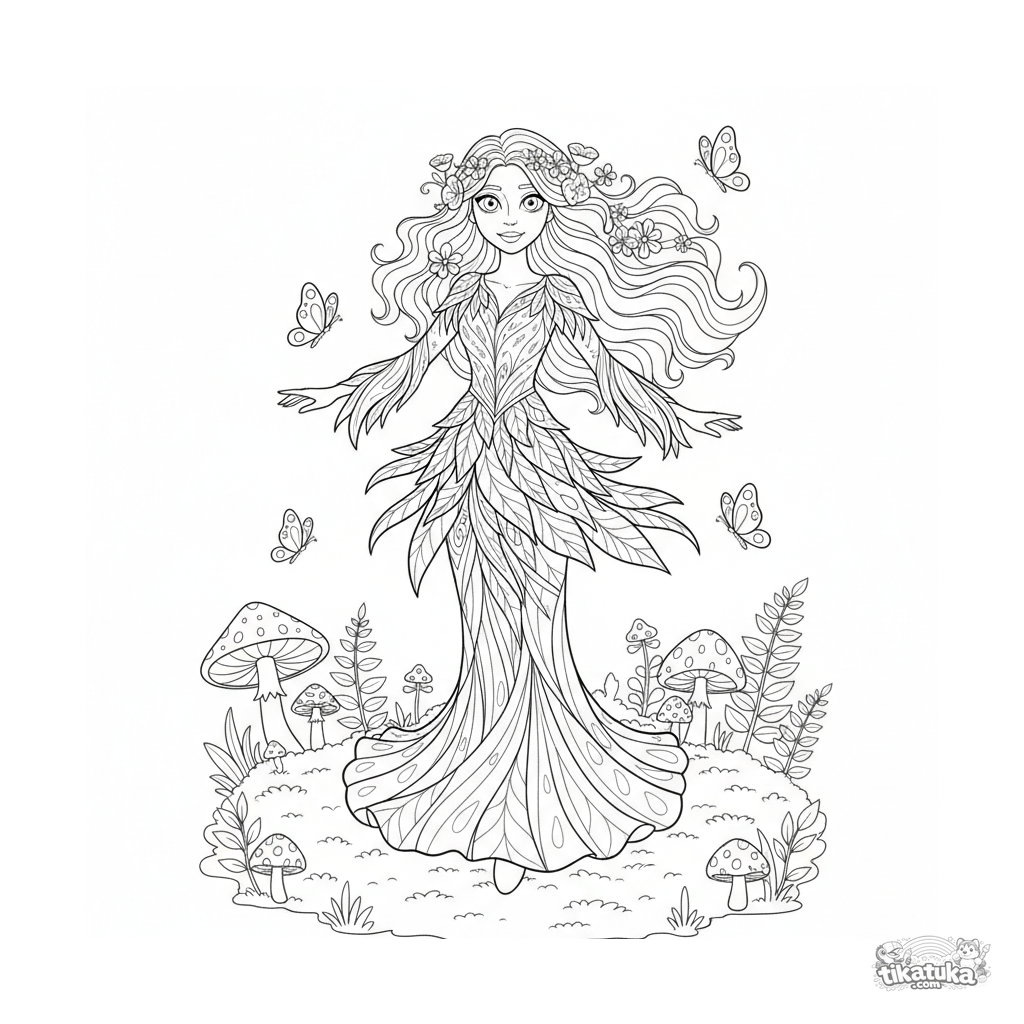 Раскраска для девочек 10-12 лет: лесная фея в детализированном платье из листьев кружится в волшебном лесу. Сложная сцена в стиле ар-нуво с бабочками и папоротниками.