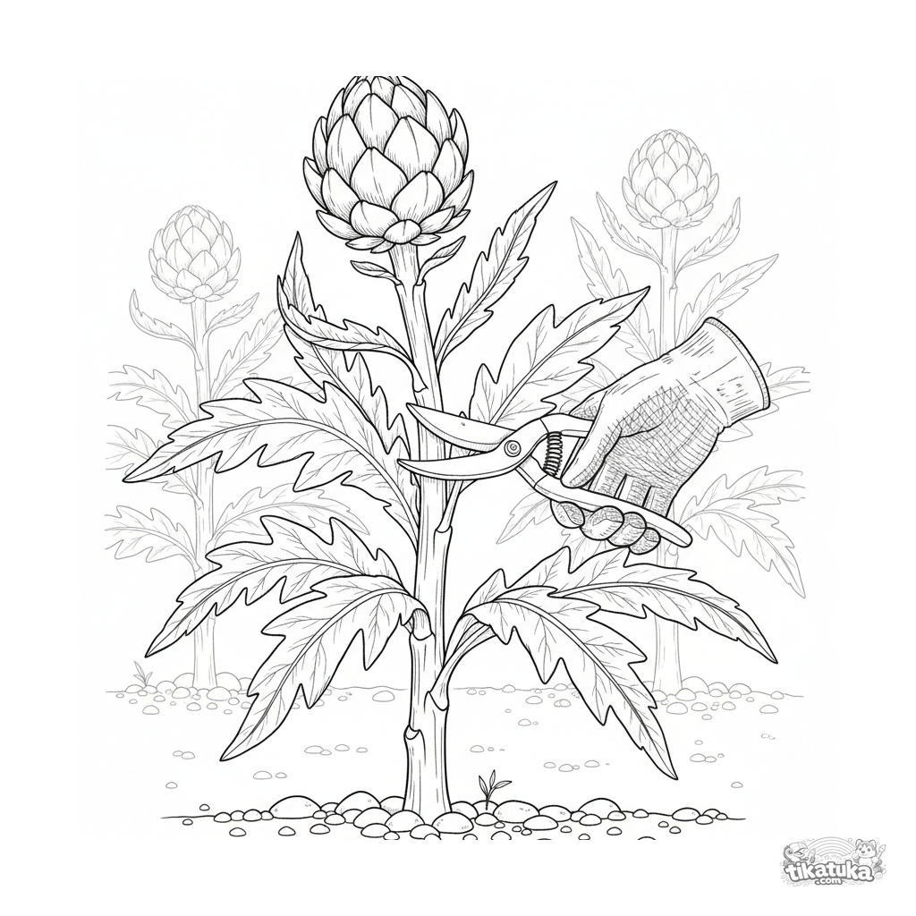 Раскраска для детей 10-12 лет: детальная сцена сбора артишока с растения. Реалистичное изображение перчатки, секатора и листьев, образовательная тема.