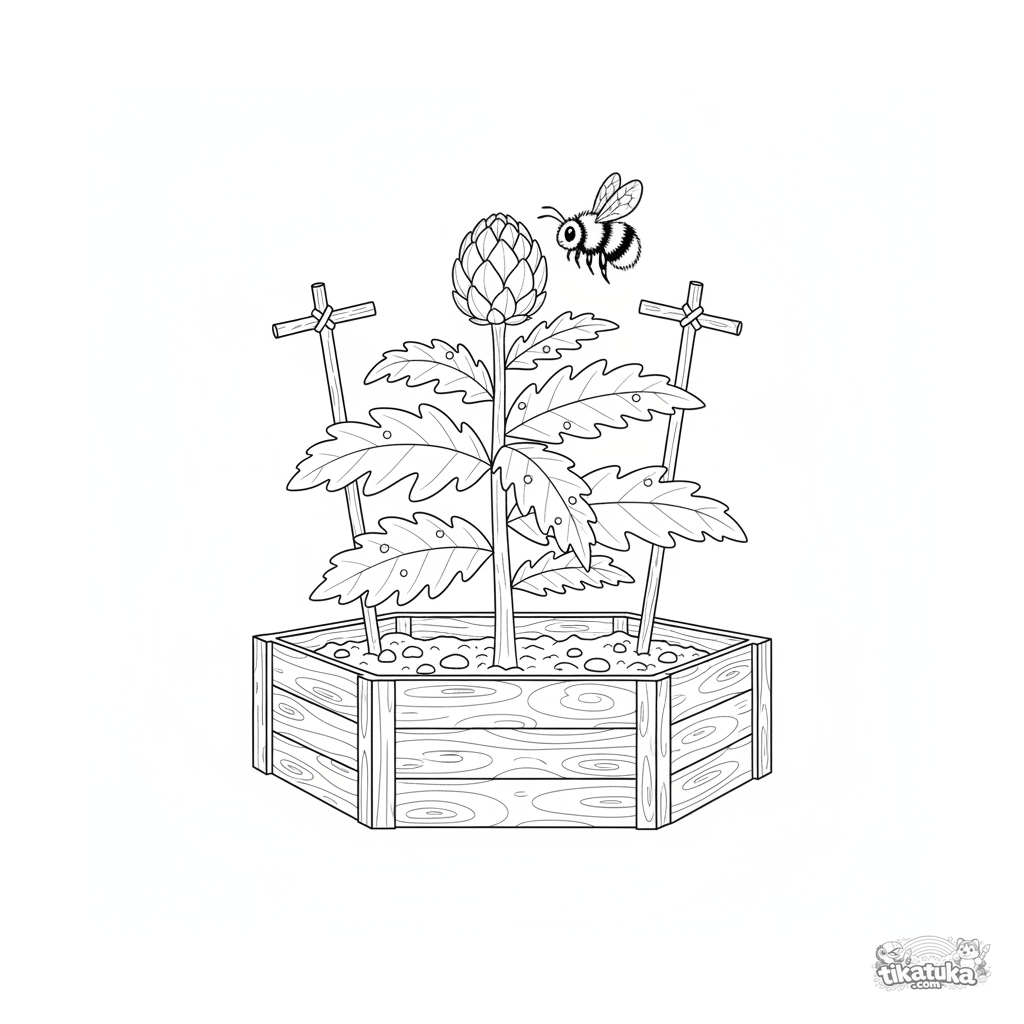 Раскраска для детей 4-6 лет: артишок растет на грядке, с каплями росы и пчелой. Четкие контуры, умеренная детализация, образовательная тема.