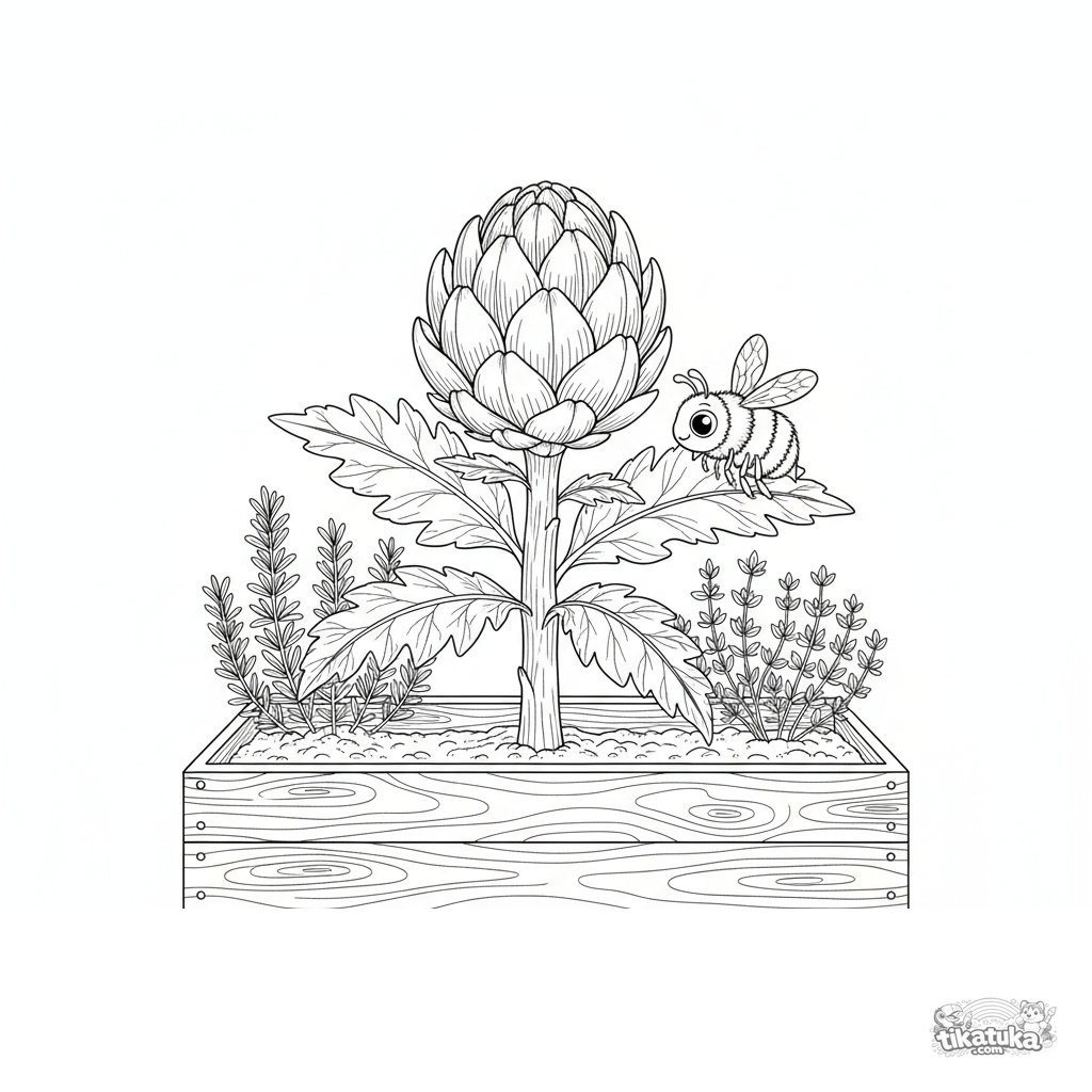 Раскраска для детей 4-6 лет: артишок растет на грядке в саду трав, рядом летает пчелка. Детализированное, но понятное образовательное изображение овоща.