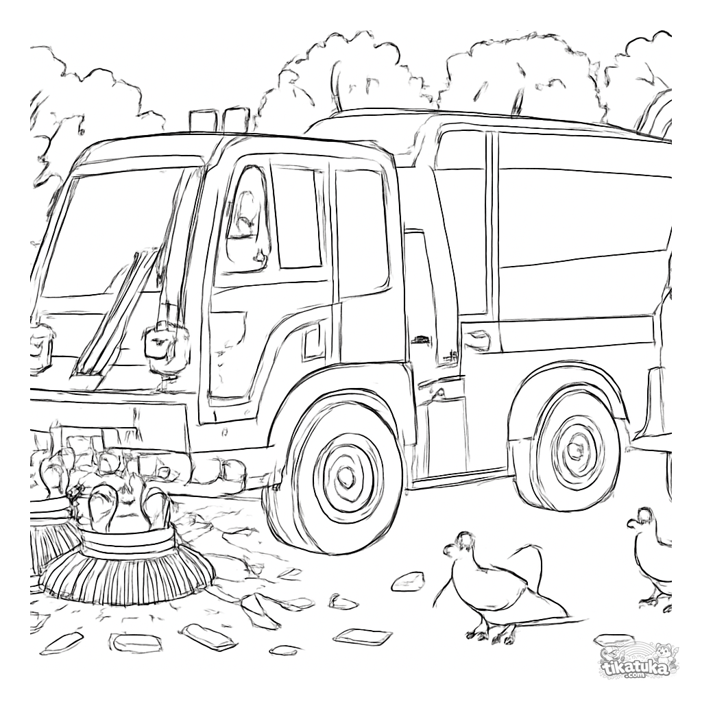 Детализированная раскраска современной шарнирной подметальной машины в работе у входа в парк. Для детей 6-9 лет. Реалистичное изображение полной специализированной техники.