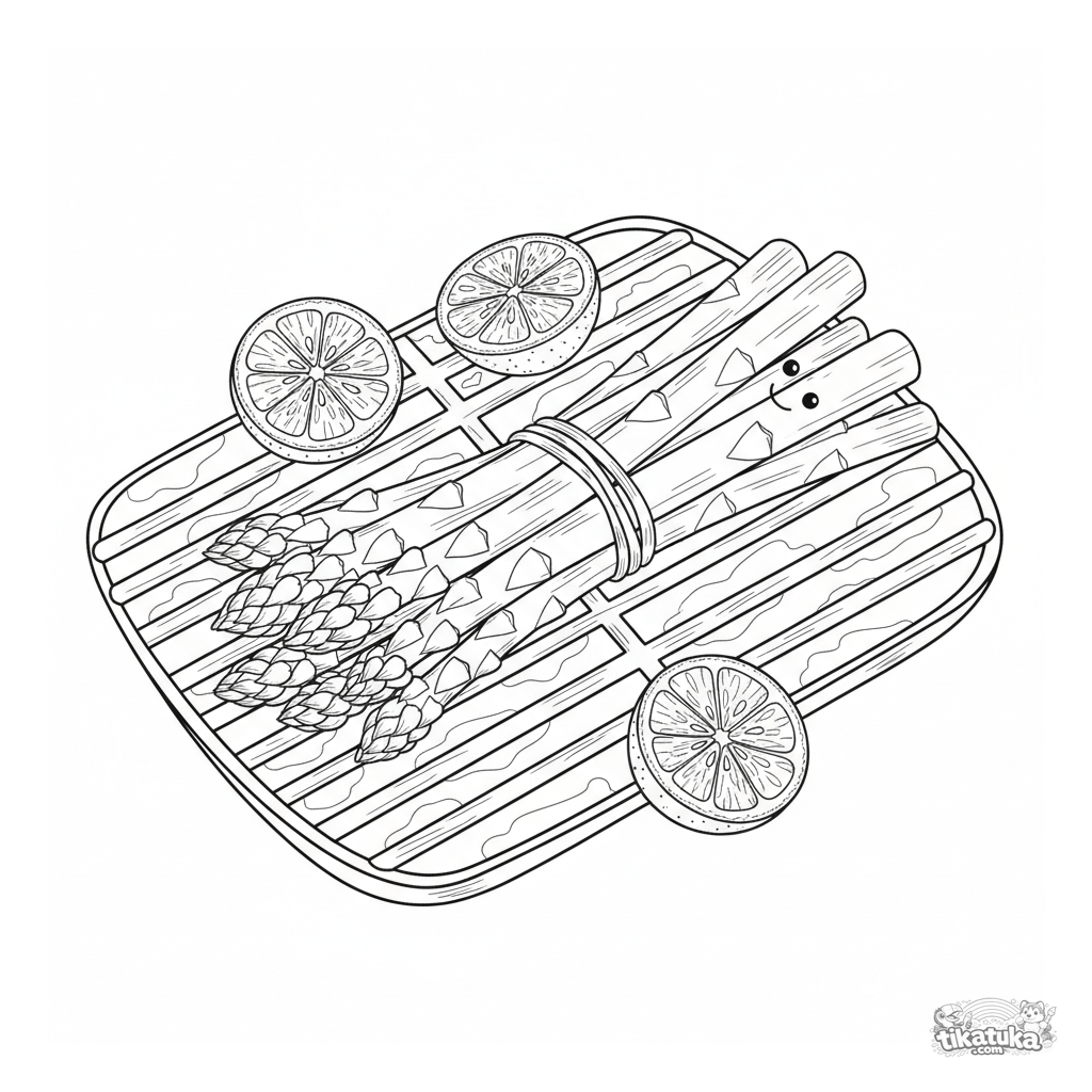 Детальная раскраска пучка спаржи на гриле в саду. Связаны луковым стеблем. Для детей 10-12 лет. Реалистичные текстуры, образовательная ценность.
